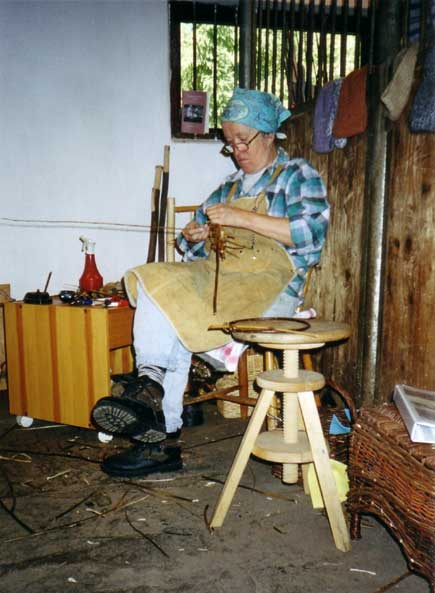 Mamma sitter i stallet och flätar.